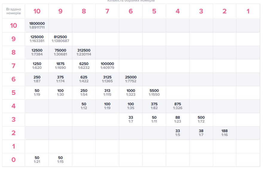 Увага: Кількість обраних чисел у комбінації не впливає на ціну, ціна стала як для комбінації з 2 чисел, так і для комбінації з 10 чисел.